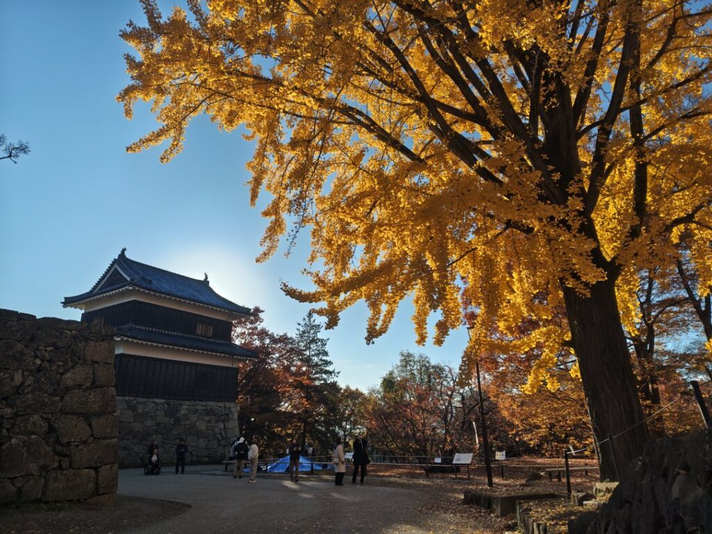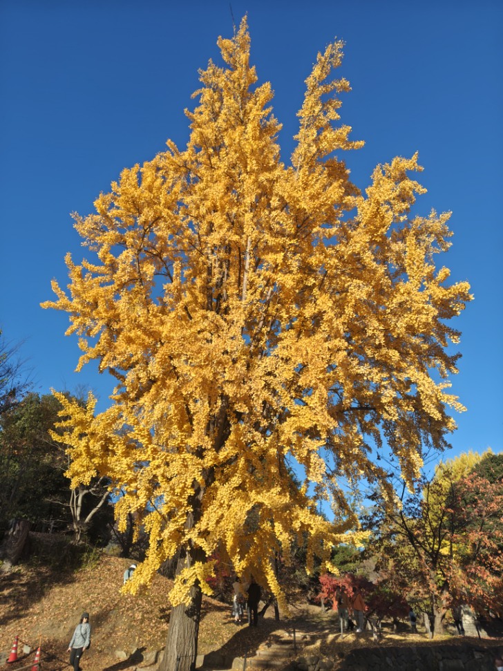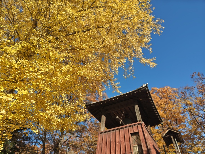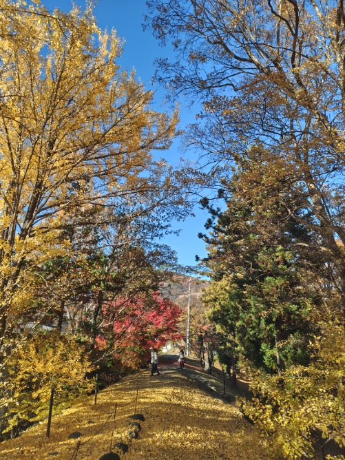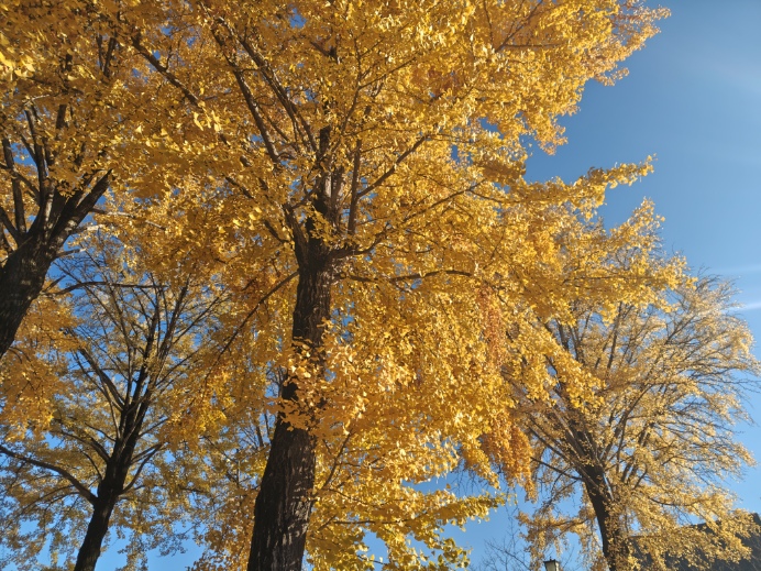 それにしても見事な黄葉。新宿や越後湯沢とは随分違う。天気も良く、イチョウの葉が眩しいほどに光って見えた。