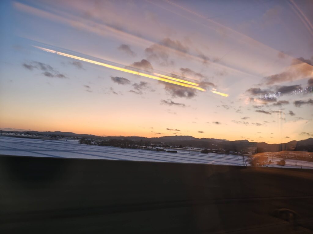 大宮からの新幹線、当然すべての車両で満席のため、立席特急券を買う。デッキのドア部分をひとり占めして外を眺めているのが好きなので立席はよく使うが、今日は帰省ラッシュのためそのデッキも通勤電車のように混んでいた。