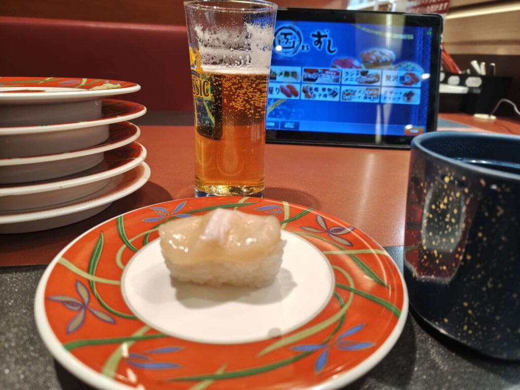 歩いている途中、空いているレストランを見つけた。地元資本の回転寿司のようだ。迷わず入店し、寿司をつまむ。