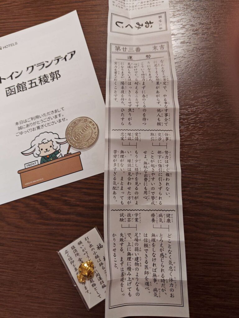 今年もおみくじをひく。その場で開こうかと思ったけど場所も無く寒いのでホテルにチェックインしてからゆっくり見てみよう。