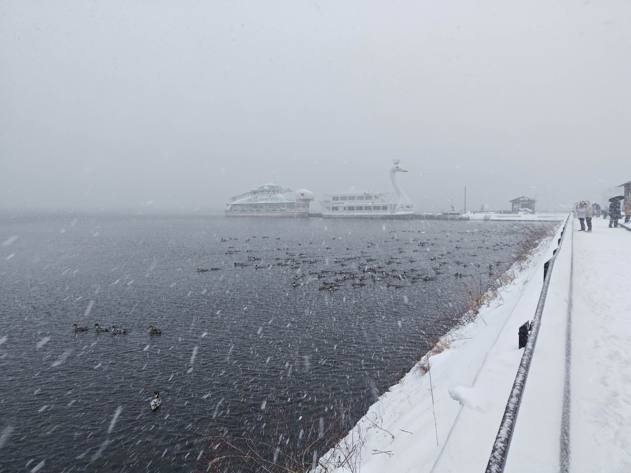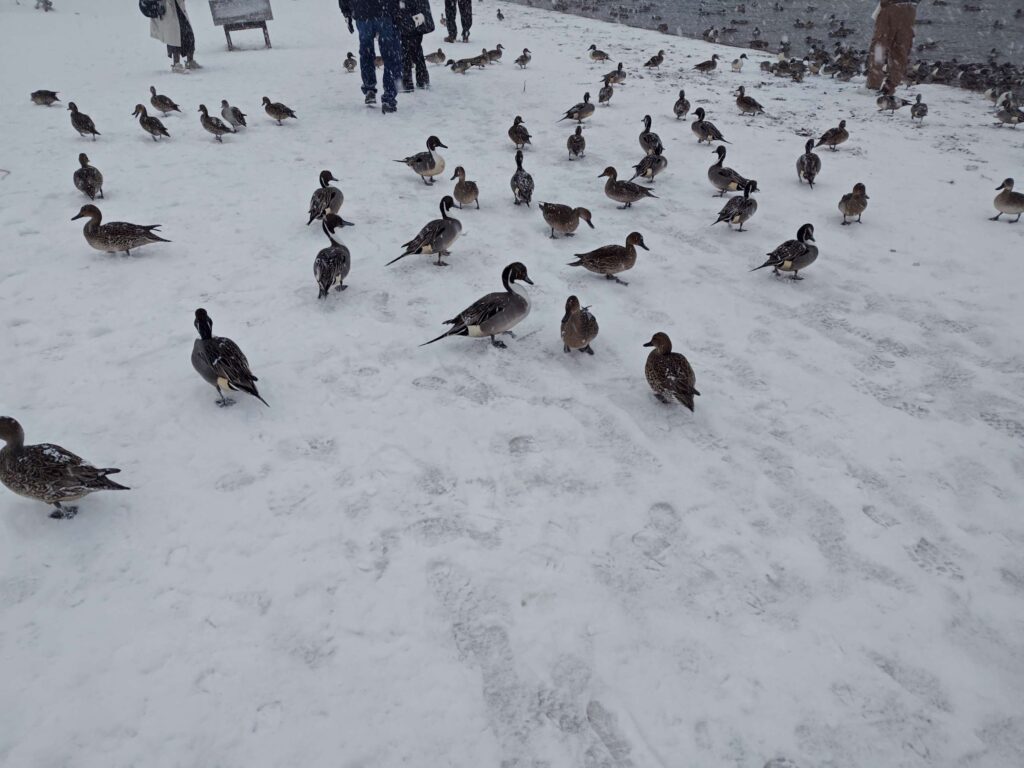 鴨がそんなに珍しいのか、いや雪に馴染みが無いのかな。