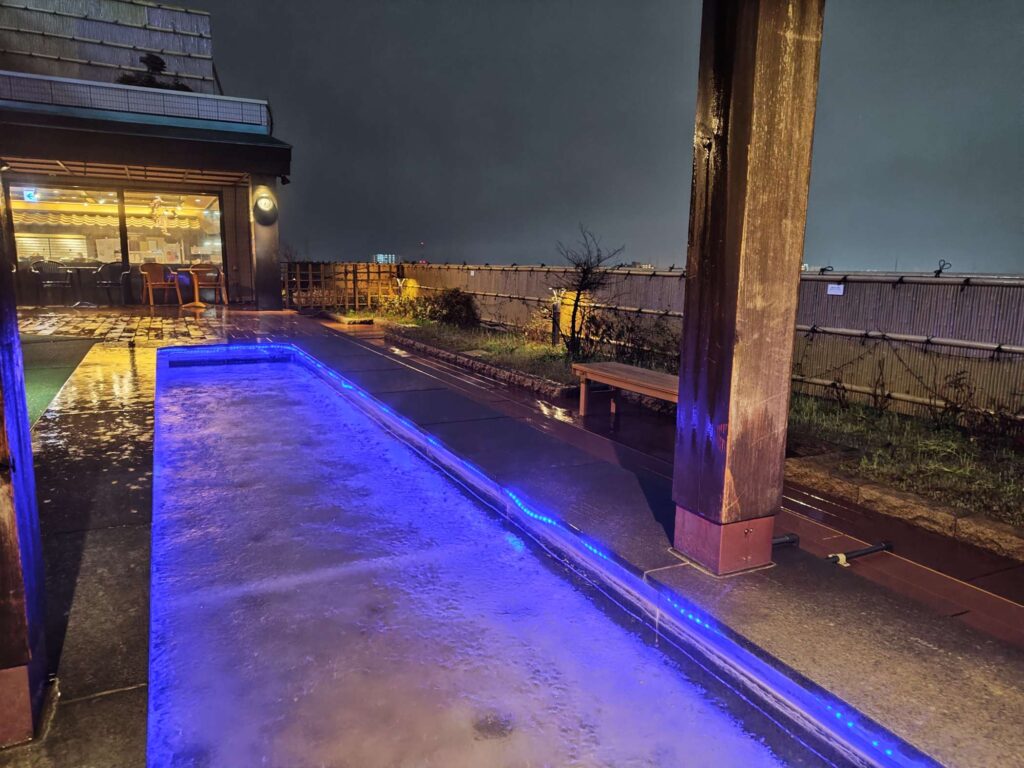 雨の中の足湯が落ち着く。雨でお湯がぬるくならるので、熱い湯をどんどん出しているようで気持ちがいい。